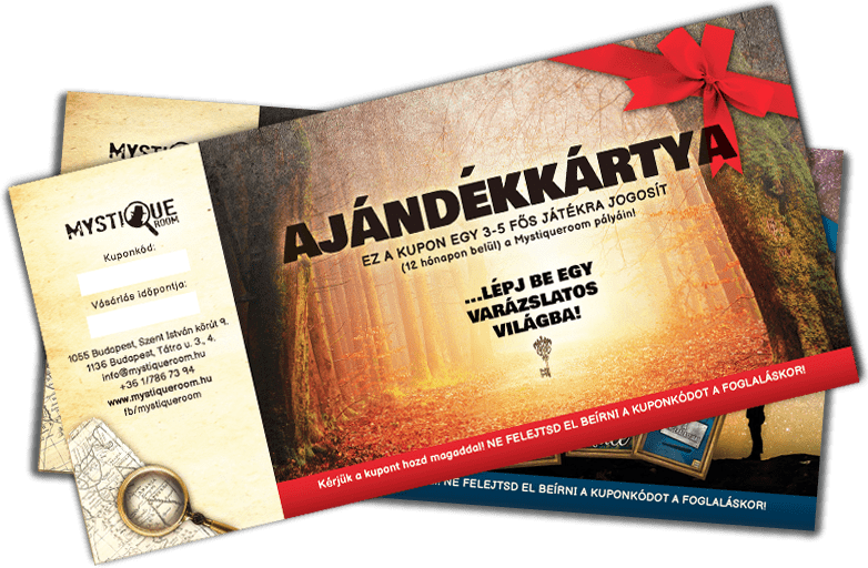 Ajándékozz névre szóló ajándékkártyát – otthonról, kényelmesen! Itt nincs sorbanállás…. Ajándékkártyáink a vásárlástól számított 1 évig érvényesek, bármely szobánkra beválthatóak, és 2-8 játékos számára ideálisak.